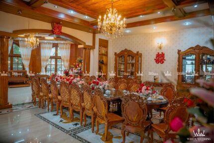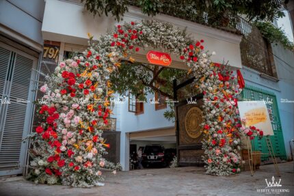 TONE ĐỎ HIỆN ĐẠI TRANG TRÍ LỄ GIA TIÊN Màu đỏ kim tuyến luôn là lựa chọn số 1 của các gia đình trong những ngày trọng đại. Hoa hồng đỏ điểm nhấn ấn tượng trên backdrop phông nền lá xanh làm nổi bật chữ hỷ CNC hoa văn cách điệu. Sự kết hợp tinh tế giữa hoa văn gold khăn trải bàn cùng với những vật trang trí khác mang đến không gian ngày lễ trở nên sang trọng hài hòa tươi mới. Lưu ý: • White Wedding sẽ tới nhà quý khách khảo sát trước khi trang trí set up. Thông thường set up hoàn thiện trước ngày lễ 1 ngày • Miễn phí phí vận chuyển và lắp đặt trang trí nhà trong vòng bán kính 5km (tính từ công ty)