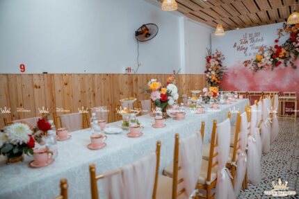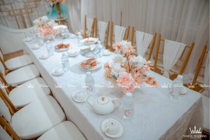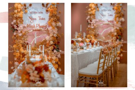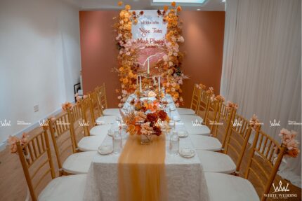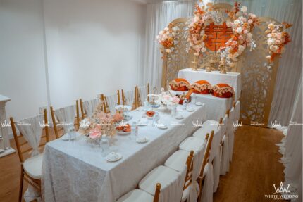 TIFFANY MYSTERY - LẤY CẢM HỨNG TỪ SỰ TỐI GIẢN NHƯNG TINH TẾ Trang trí lễ gia tiên - Được lấy cảm hứng từ sắc đỏ truyền thống, chấm phá thêm sắc cam rực rỡ, sử dụng thêm sắc hồng nhẹ nhàng tạo nên một không gian lễ gia tiên tươi mới, ngọt ngào. Backdrop được sử dụng tone vàng đồng sang trọng với những đường cắt tinh tế làm tôn lên trọn vẹn sắc màu của chữ hỷ và các line hoa. Lưu ý: • White Wedding sẽ tới nhà quý khách khảo sát trước khi trang trí set up. Thông thường set up hoàn thiện trước ngày lễ 1 ngày • Miễn phí phí vận chuyển và lắp đặt trang trí nhà trong vòng bán kính 5km (tính từ công ty)