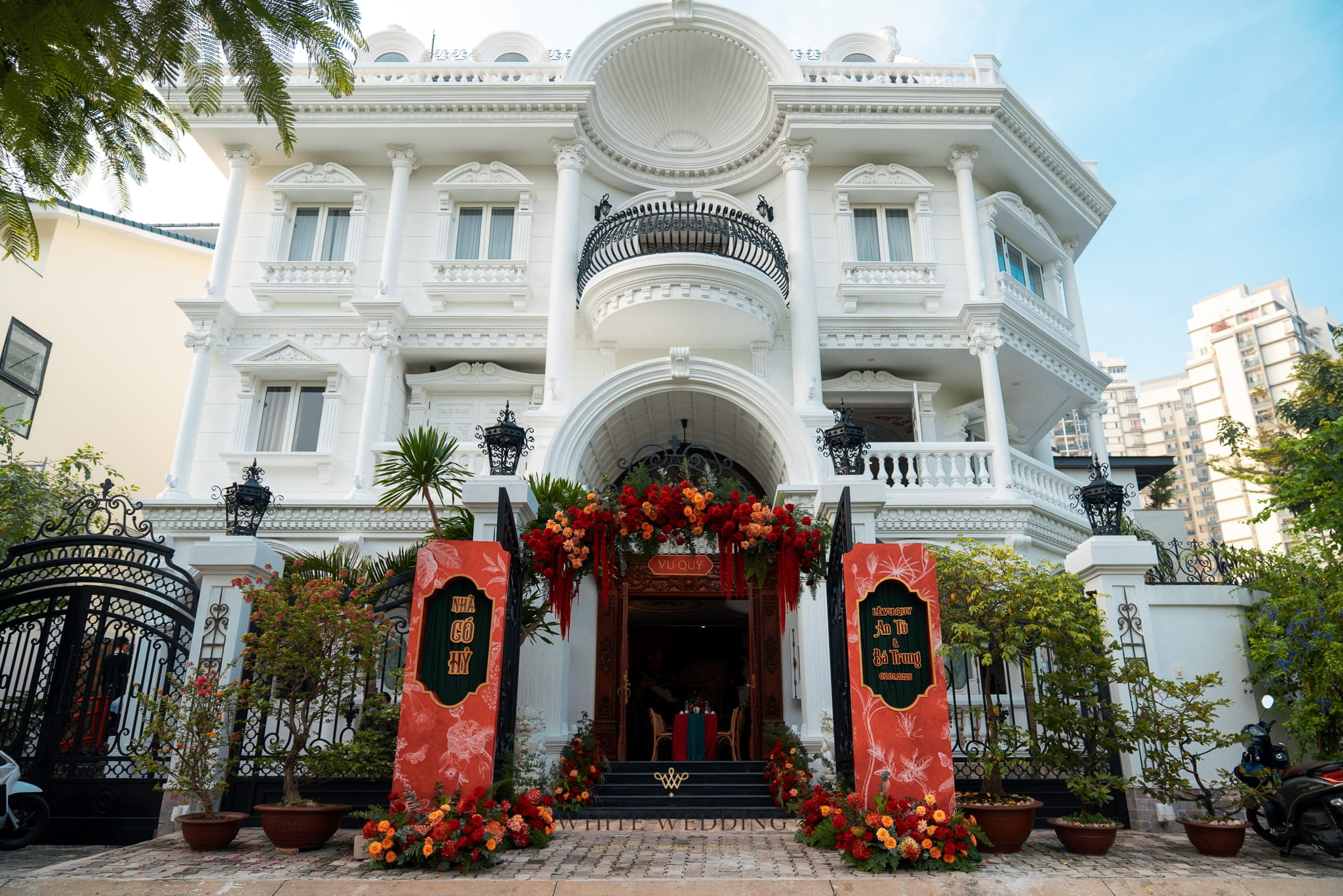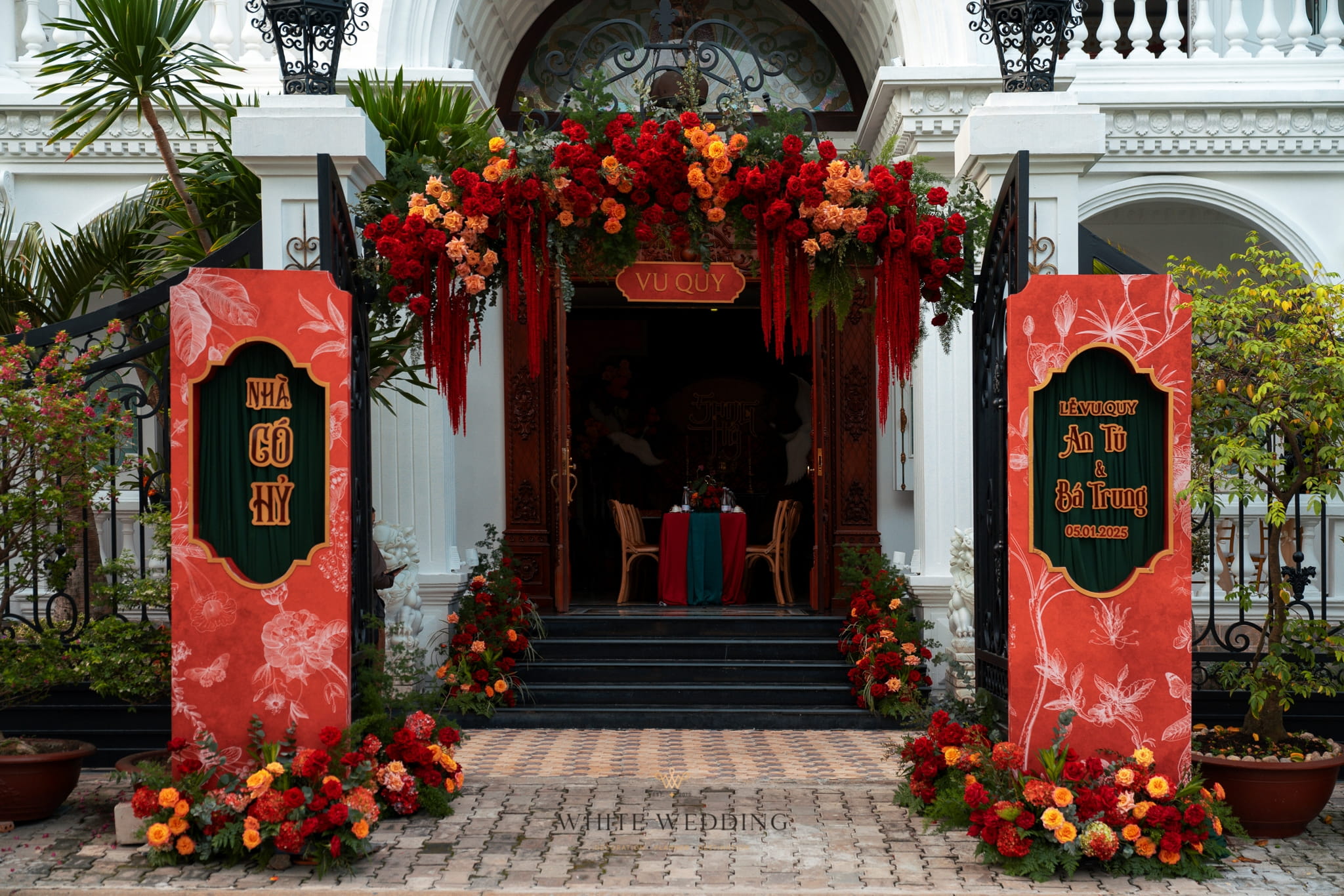 Hệ cổng hoa rực rỡ mang sắc đỏ cam tựa như những ngọn lửa nhỏ thắp sáng sự hân hoan. Sự đối lập giữa kiến trúc biệt thự trắng sang trọng và những mảng màu nóng, tạo nên một lời chào mừng vừa trang trọng, vừa đậm chất hoài cổ của những gia đình khuê các xưa.