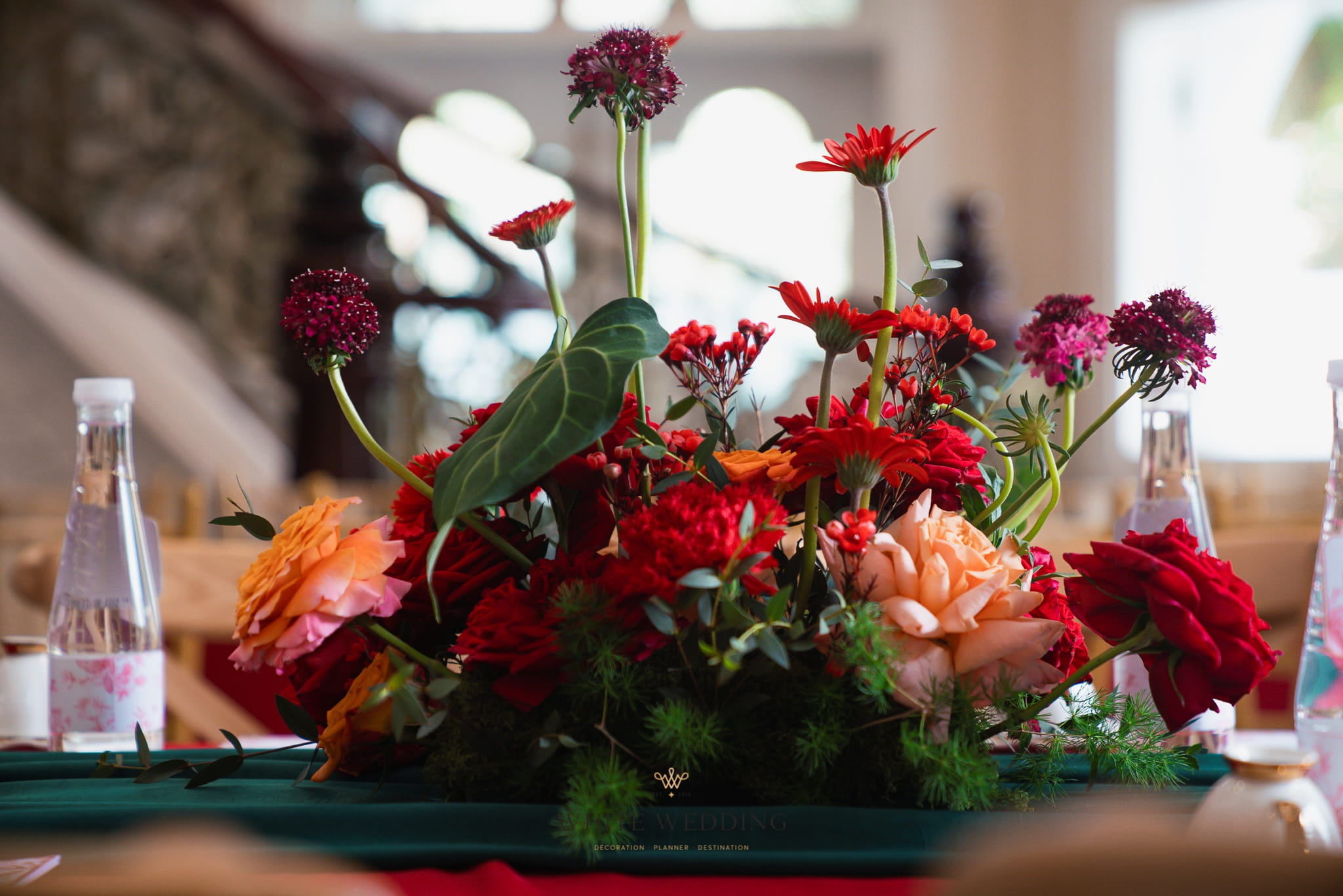 Trên nền đỏ quyền quý kết hợp cùng nhung sắc xanh Emerald, White Wedding dệt nên một không gian Phong cách Đông Phương đậm chất điện ảnh.