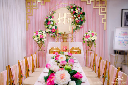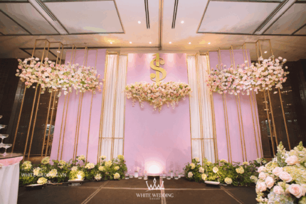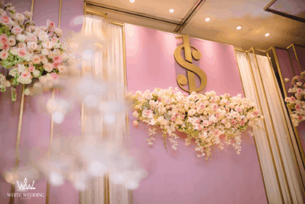 Có thể một tiệc cưới tone màu hồng ngọt ngào và gold ấm áp, kết hợp với họa tiết trang trí đơn giản sẽ kém phần sang trọng, nhưng hiệu ứng của backdrop đã tạo nên không gian ngày cưới trở nên thật ấn tượng với vẻ đẹp vô tận và thanh lịch. Gói trang trí nhà hàng bao gồm các hạng mục sau: - Backdrop - Sân khấu, - Catwalk - Bàn gallery