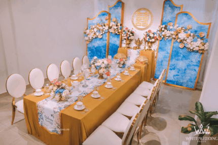SIÊU PHẨM MỚI TRANG TRÍ GIA TIÊN WATERCOLOR ART Backdrop gây ấn tượng mạnh mẽ với lối hoa văn nghệ thuật, kết hợp dãy hoa lượn sóng uyển chuyển trang trí cho phông nền thêm tinh tế. Không gian ngày cưới trở nên sang trọng - đẳng cấp hơn với ghế Louis XVI và những phụ kiện đi kèm cao cấp khác như Bộ ấm tách quý tộc cực kì xa hoa. Lưu ý: White Wedding sẽ tới nhà quý khách khảo sát trước khi trang trí set up. Thông thường set up hoàn thiện trước ngày lễ 1 ngày Miễn phí phí vận chuyển và lắp đặt trang trí nhà trong vòng bán kính 5km (tính từ công ty)